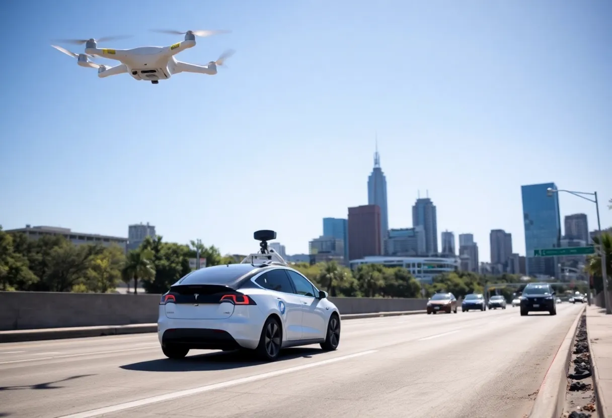 Futuristic autonomous Tesla vehicles operating as robotaxis in Austin, Texas